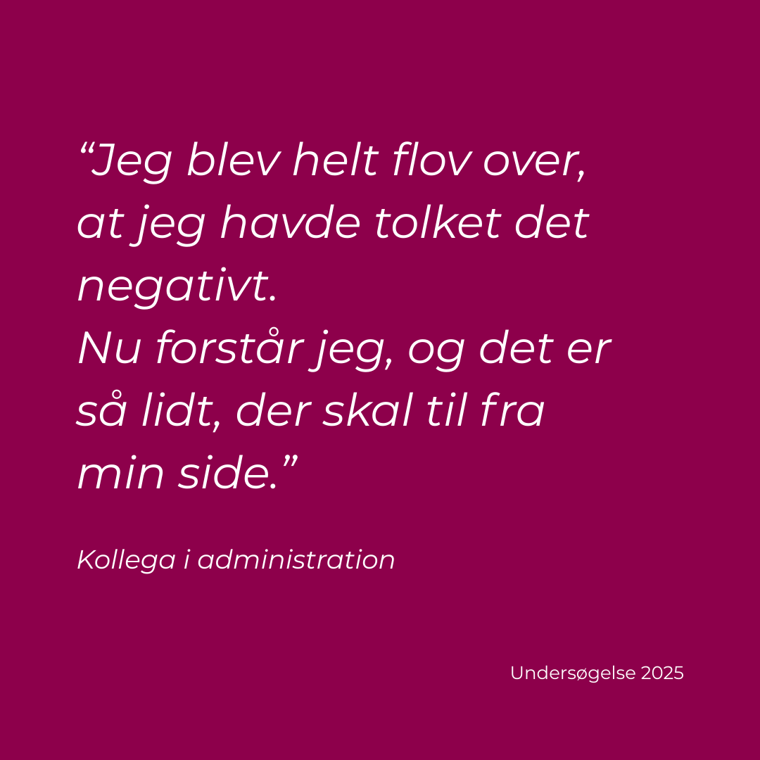 “Jeg blev helt flov over, at jeg havde tolket det negativt. Nu forstår jeg, og det er så lidt, der skal til fra min side.”