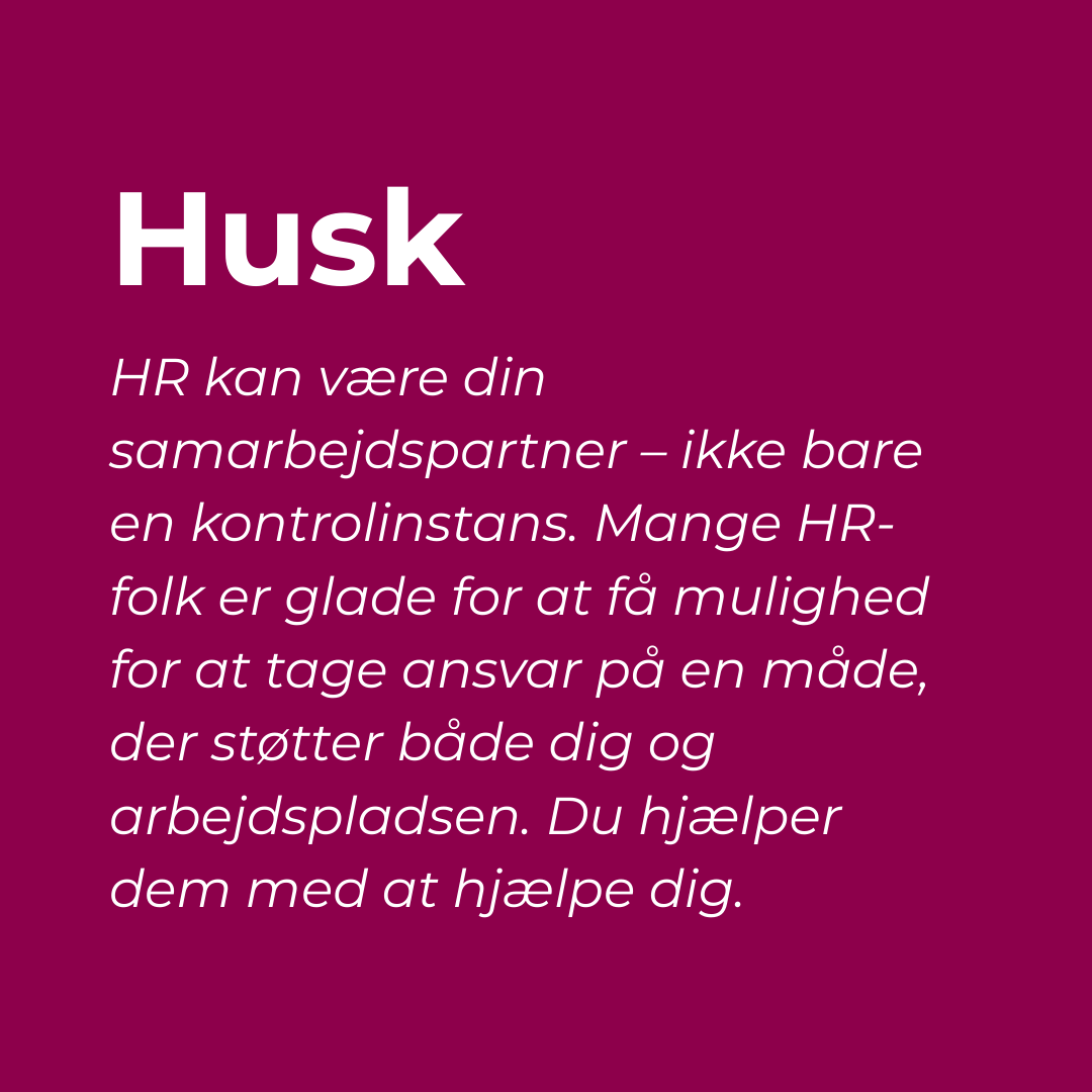 Mange HR-medarbejdere vil gerne hjælpe, men de har brug for at vide, hvad du har brug for og hvordan. Mange oplever, at det kan give ro at sætte ord på bekymringerne.