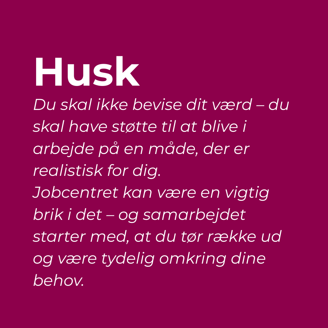 Har du udtalelser fra læge, arbejdsplads eller tidligere forløb, kan det styrke dialogen. Og hvis noget er uklart, så spørg. Det er jobcentrets opgave at forklare dine rettigheder og muligheder.