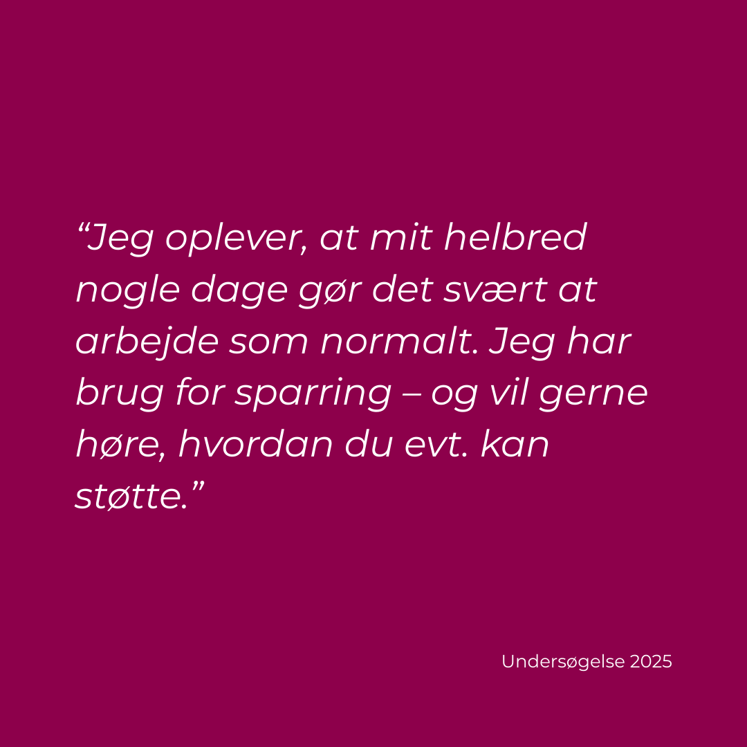 Din tillidsrepræsentant og arbejdsmiljørepræsentant kan være gode allierede, hvis du oplever, at helbredet udfordrer dit arbejdsliv. De har tavshedspligt, kender arbejdspladsens praksis og kan hjælpe med at finde vej til løsninger – både i dialog med ledelsen og i forhold til dine rettigheder.