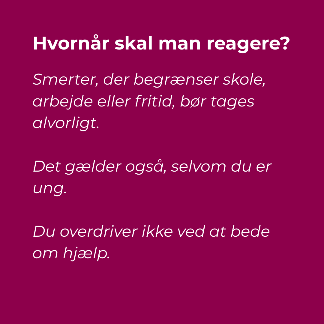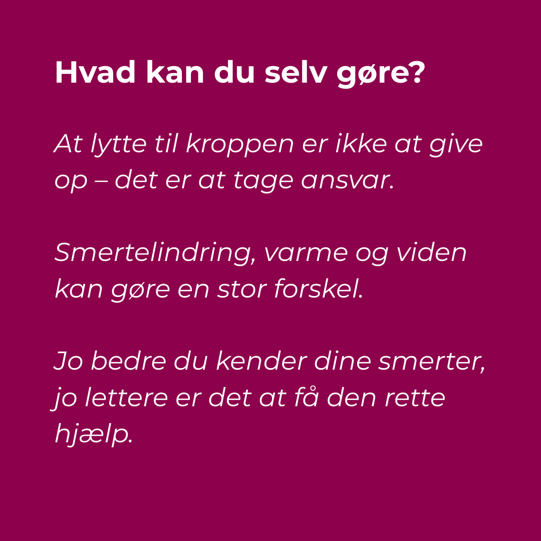 Smerter skal ikke ignoreres, og det er ikke et tegn på svaghed at reagere eller søge støtte. Jo tidligere man taler om smerter og får dem taget alvorligt, jo bedre mulighed er der for at få lindring, viden og ro omkring sin krop.