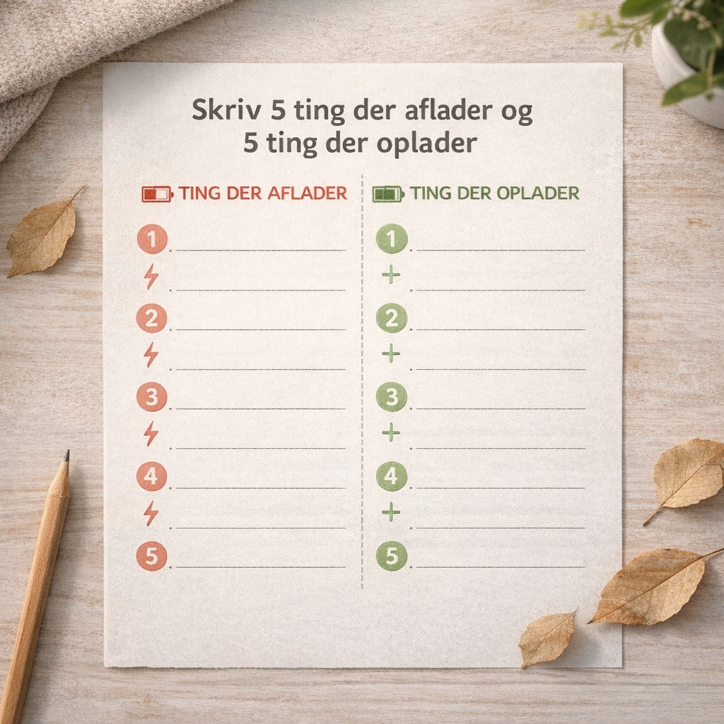 Batterimodellen er et visuelt redskab, der hjælper dig med at forstå, hvad der aflader dig, og hvad der oplader dig. Den gør det lettere at tage hensyn til kroppen uden skyld eller forklaringer.